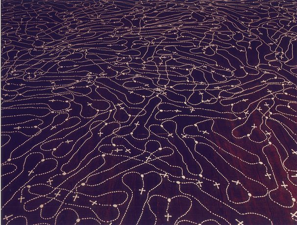 Marcia X. Desenhando com terços. Performance e Instalação, Anos 1990.